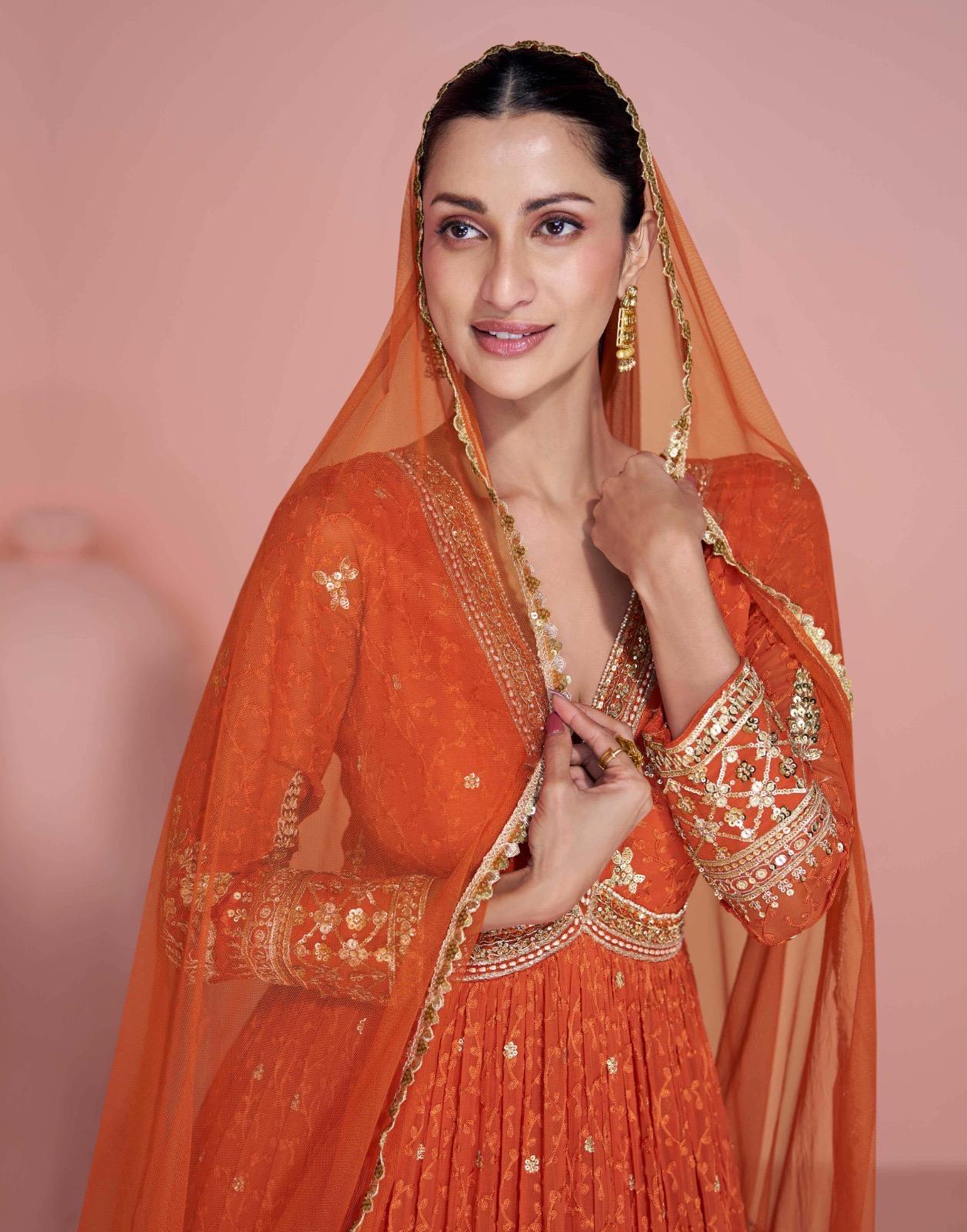 Gulkayra Designer Meenat Real Chinon Embroidered Wedding Wear Gown Set